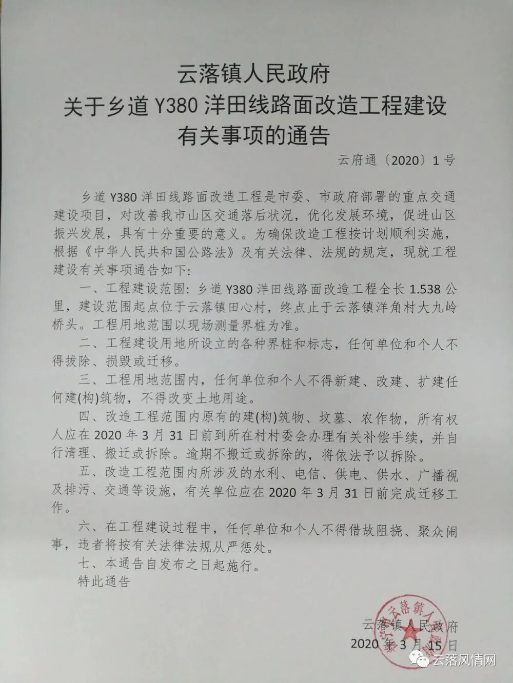 一、工程建设范围:乡道Y380洋田线路面改造工程全长1.538公里,建设范围起点位于云落镇田心村,终点止于云落镇洋角村大九岭桥头。工程用地范围以现场测量界桩为准。