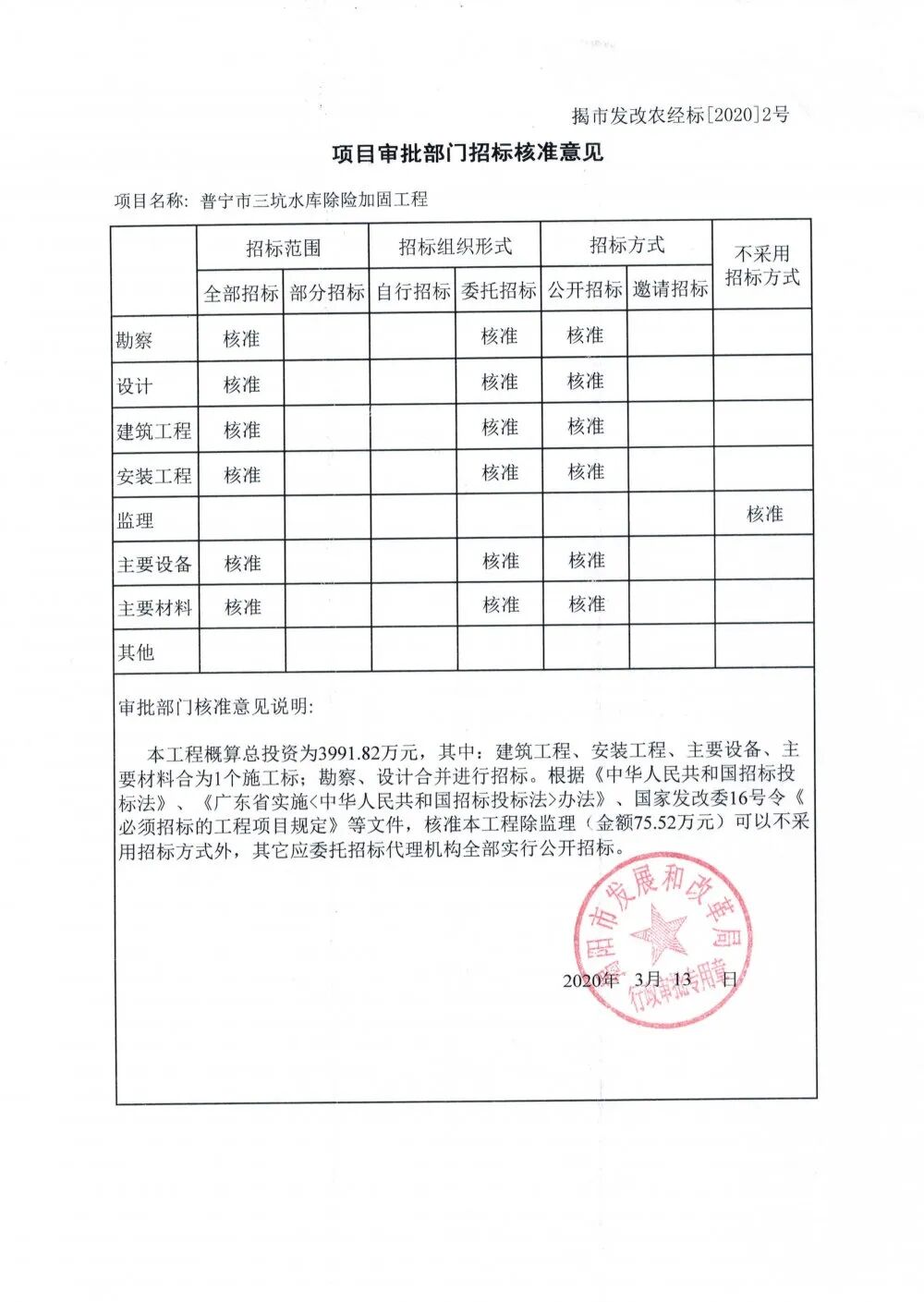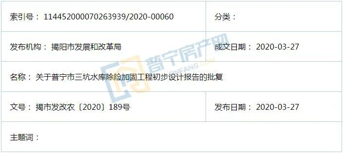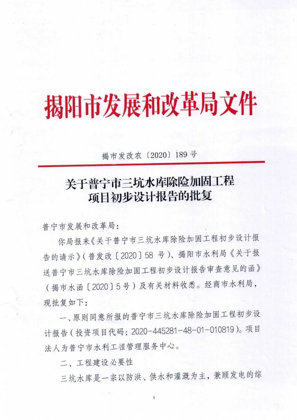 3月初,小房君曾报道过总投资3991.82万!普宁市三坑水库除险加固工程审批公示!近日,该工程迎来新进展,揭阳市发展和改革局发布了关于普宁市三坑水库除险加固工程初步设计报告的批复,原则同意所报的普宁市三坑水库除险加固工程初步设计报告(投资项目代码:2020-445281-48-01-010819)项目,法人为普宁市水利工程管理服务中心。