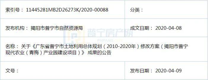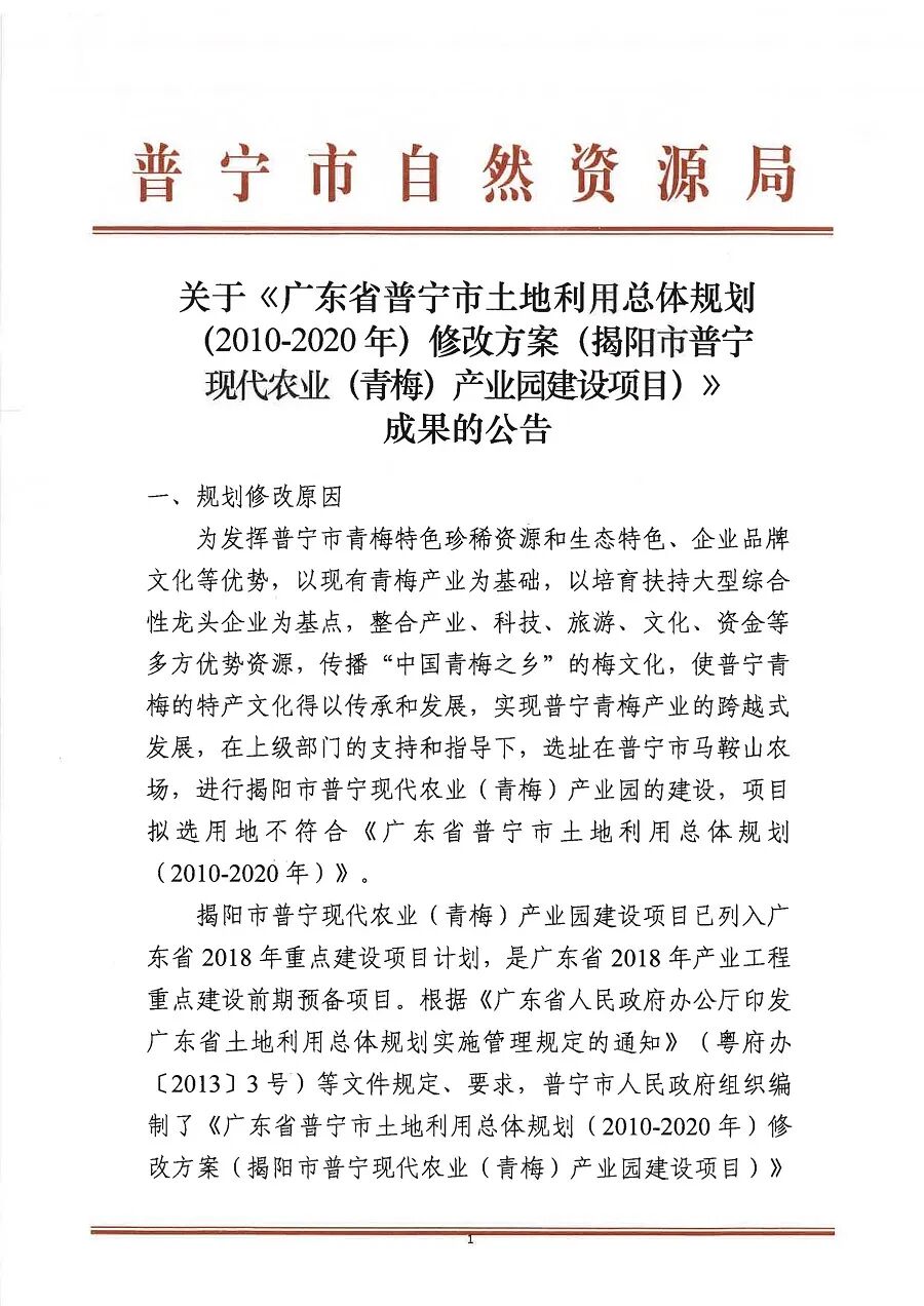 今天,普宁市自然资源局发布了关于《广东省普宁市土地利用总体规划(2010-2020年)修改方案(揭阳市普宁现代农业(青梅)产业园建设项目)》成果的公告。《方案》已于2020年4月1日通过广东省人民政府批准(粤府土审(01)[2020]42号)。根据相关法律、法规要求,现将《方案》成果向社会公告。