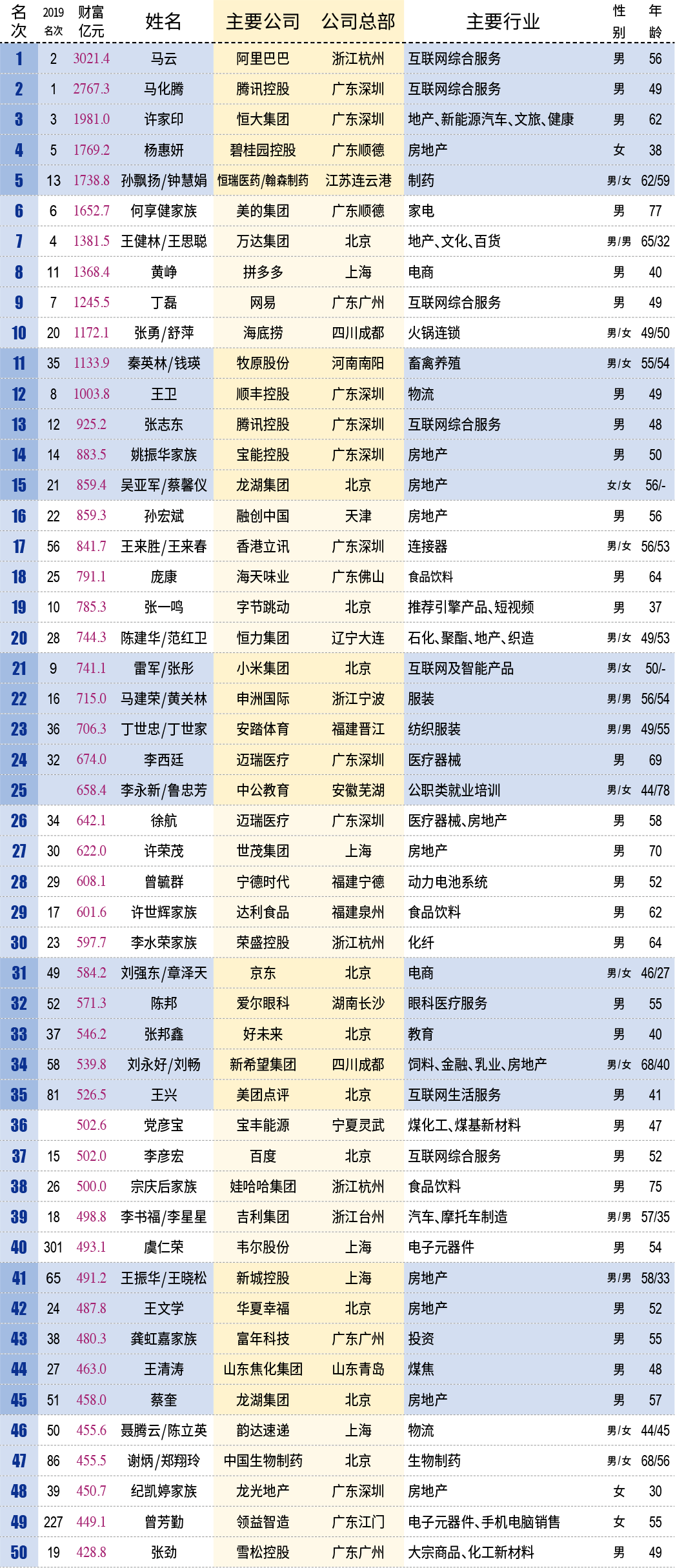 15年前,中国还没有百亿富人。而今年,上榜富豪人均财富首次超过200亿元,达到214.3亿元。榜单显示,今年百亿富人已达315位,首富马云身家跃过3000亿元。排名第二的腾讯控股马化腾身家为2767.3亿元;恒大集团许家印身家为1981亿元,位居第三。