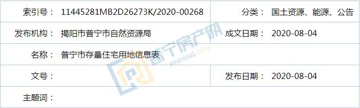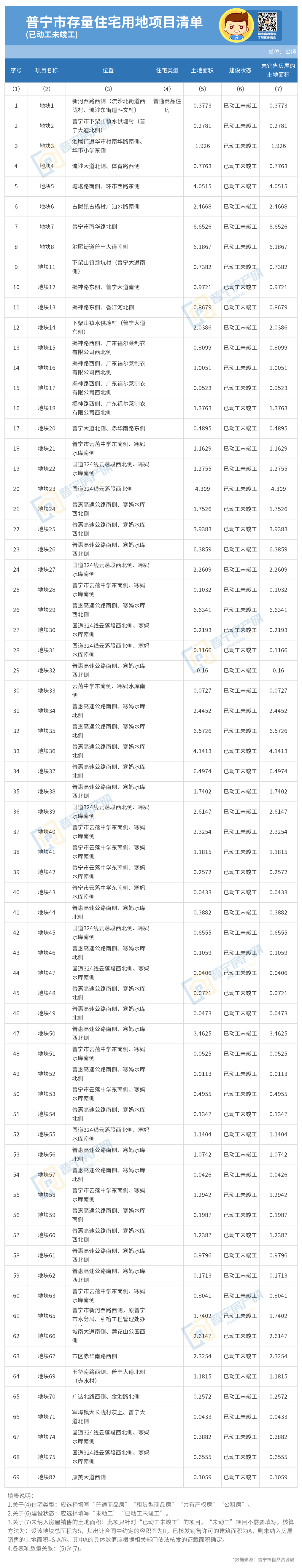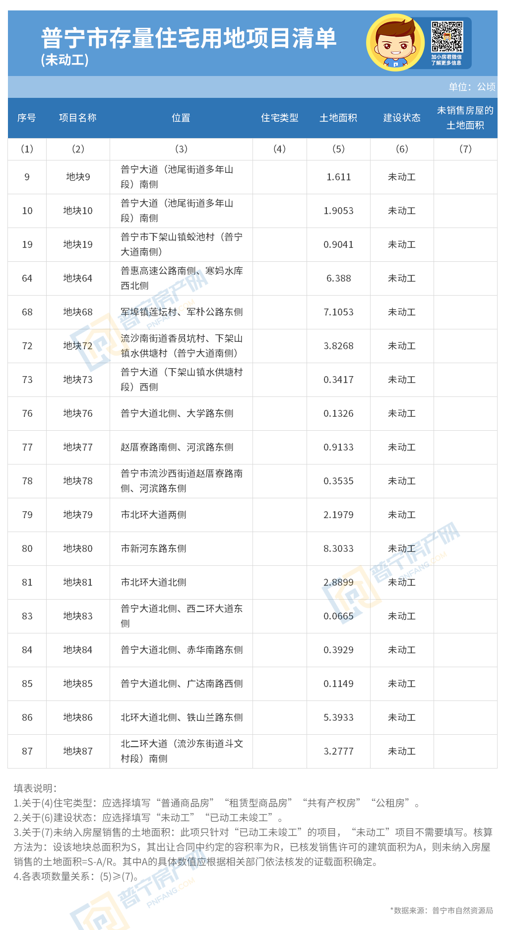据悉,普宁市存量住宅用地项目总数87宗,总面积156.8385公顷(2352.5775亩)。其中,未动工土地面积46.118公顷(691.77亩),已动工未竣工土地面积110.7205公顷(1660.8075亩)。未销售房屋的土地面积110.7205公顷。