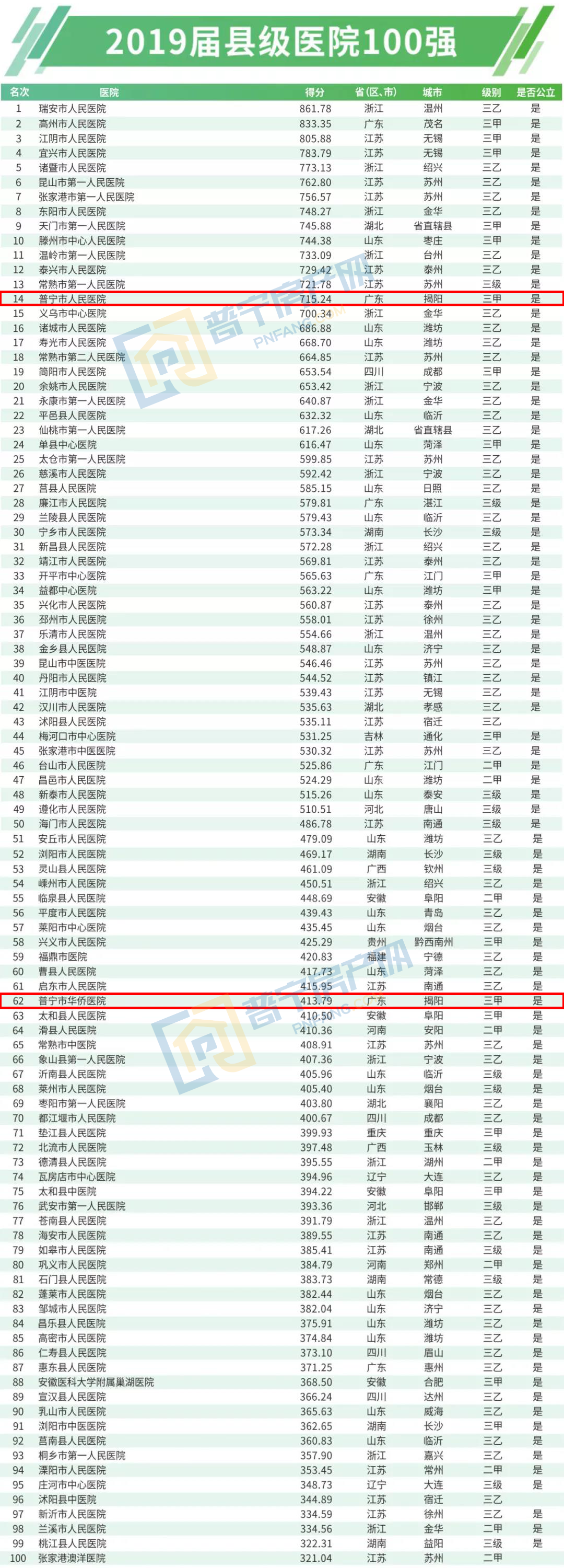 其中,普宁市人民医院名列榜单第14位,在广东省县级医院中排名第2位。普宁市华侨医院名列榜单第62位,在广东省县级医院中排名第6位。