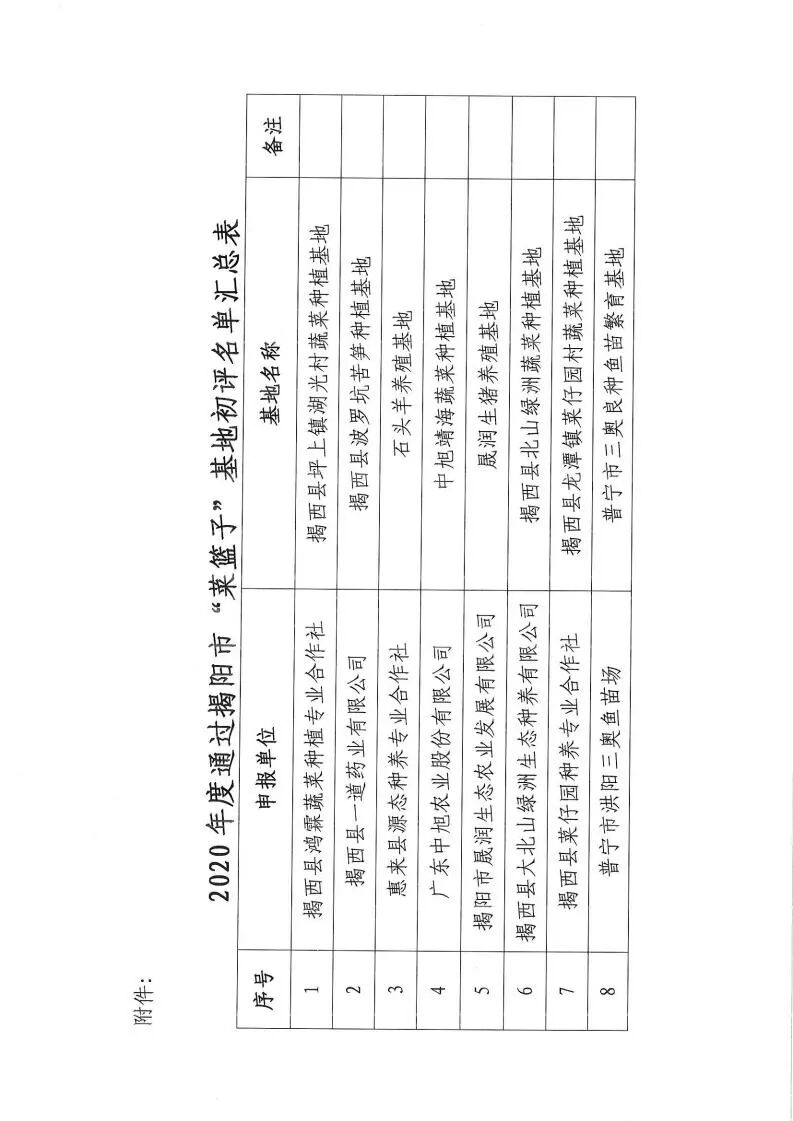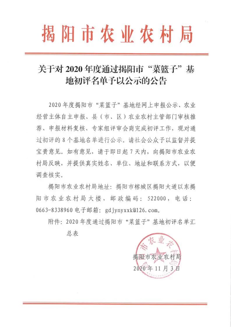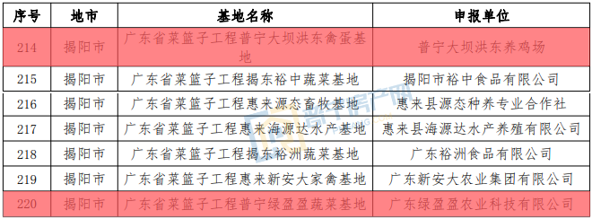 此次省“菜篮子”基地初评拟通过名单共223个,其中普宁2个,分别是:广东省菜篮子工程普宁大坝洪东禽蛋基地、广东省菜篮子工程普宁绿盈盈蔬菜基地。