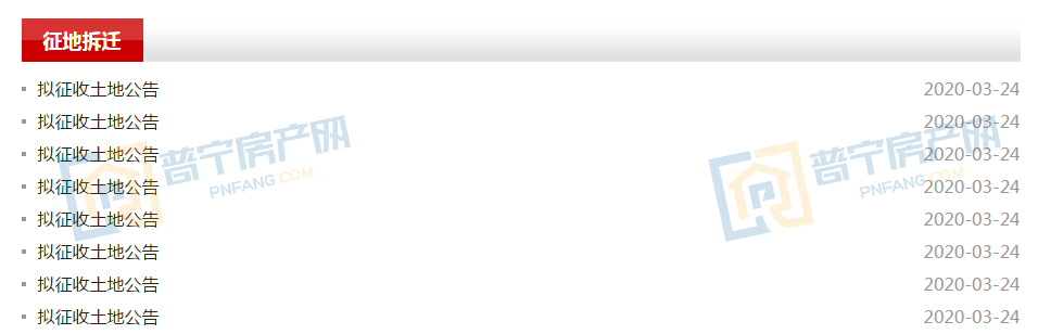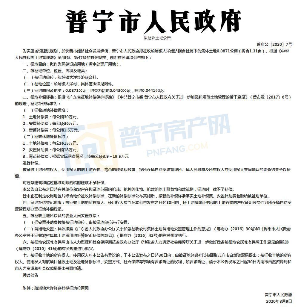一、大坪镇大坪村 一、征地目的:拟作为环保设施用地(污水处理厂用地)。 二、被征地单位、位置、面积及地类: (一)被征地单位:大坪镇大坪经济联合社。 (二)征地位置:大坪镇大坪村,具体范围详见附件。 (三)征地面积及地类:0.4985公顷,地类为园地0.0114公顷,林地0.4871公顷。 三、征地补偿标准:根据《广东省征地补偿保护标准》《中共普宁市委 普宁市人民政府关于进一步加强和规范土地管理的若干意见》(普市发〔2017〕6号)的规定,征地补偿标准为: (一)征收园地补偿标准: 1.土地补偿费:每公顷24万元。 2.安置补助费:每公顷28.8万元。 3.青苗补偿费:根据实际调查情况,按每公顷3.9~19.5万元进行补偿。 (二)征收林地补偿标准: 1.土地补偿费:每公顷15万元。 2.安置补助费:每公顷18万元。 3.青苗补偿费:根据实际调查情况,按每公顷3.9~19.5万元进行补偿。 二、广太镇平宝山村 一、征地目的:拟作为环保设施用地(污水处理厂用地)。 二、被征地单位、位置、面积及地类: (一)被征地单位:广太镇平宝山经济联合社。 (二)征地位置:广太镇平宝山村,具体范围详见附件。 (三)征地面积及地类:0.2229公顷,地类为园地0.2227公顷,未利用地0.0002公顷。 三、征地补偿标准:根据《广东省征地补偿保护标准》《中共普宁市委 普宁市人民政府关于进一步加强和规范土地管理的若干意见》(普市发〔2017〕6号)的规定,征地补偿标准为: (一)征收园地补偿标准: 1.土地补偿费:每公顷33万元。 2.安置补助费:每公顷49.5万元。 3.青苗补偿费:根据实际调查情况,按每公顷3.9~19.5万元进行补偿。 (二)征收未利用地补偿标准为每公顷24万元。 三、高埔镇高埔村、龙堀村 一、征地目的:拟作为环保设施用地(污水处理厂用地)。 二、被征地单位、位置、面积及地类: (一)被征地单位:高埔镇高埔村高埔经济联合社、龙堀村塘背经济联合社。 (二)征地位置:高埔镇高埔村、龙堀村,具体范围详见附件。 (三)征地面积及地类:征收高埔镇高埔村高埔经济联合社土地0.052公顷,地类均为园地;征收龙堀村塘背经济联合社土地0.4813公顷,地类为园地0.4471公顷,其他农用地0.0342公顷。 三、征地补偿标准:根据《广东省征地补偿保护标准》《中共普宁市委 普宁市人民政府关于进一步加强和规范土地管理的若干意见》(普市发〔2017〕6号)的规定,征地补偿标准为: (一)征收园地补偿标准: 1.土地补偿费:每公顷24万元。 2.安置补助费:每公顷28.8万元。 3.青苗补偿费:根据实际调查情况,按每公顷3.9~19.5万元进行补偿。 (二)征收其他农用地补偿标准为每公顷67.5万元。 四、云落镇九岭村 一、征地目的:拟作为环保设施用地(污水处理厂用地)。 二、被征地单位、位置、面积及地类: (一)被征地单位:云落镇九岭经济联合社。 (二)征地位置:云落镇九岭村,具体范围详见附件。 (三)征地面积及地类:征收云落镇九岭经济联合社土地0.8650公顷,地类为园地0.155公顷,其他农用地0.0187公顷,未利用地0.6913公顷。 三、征地补偿标准:根据《广东省征地补偿保护标准》《中共普宁市委 普宁市人民政府关于进一步加强和规范土地管理的若干意见》(普市发〔2017〕6号)的规定,征地补偿标准为: (一)征收园地补偿标准: 1.土地补偿费:每公顷24万元。 2.安置补助费:每公顷28.8万元。 3.青苗补偿费:根据实际调查情况,按每公顷3.9~19.5万元进行补偿。 (二)征收其他农用地补偿标准为每公顷67.5万元。 (三)征收未利用地补偿标准为每公顷19.5万元。 五、船埔镇大洋村 一、征地目的:拟作为环保设施用地(污水处理厂用地)。 二、被征地单位、位置、面积及地类: (一)被征地单位:船埔镇大洋经济联合社。 (二)征地位置:船埔镇大洋村,具体范围详见附件。 (三)征地面积及地类:0.0871公顷,地类为耕地0.0430公顷,林地0.0441公顷。 三、征地补偿标准:根据《广东省征地补偿保护标准》《中共普宁市委 普宁市人民政府关于进一步加强和规范土地管理的若干意见》(普市发〔2017〕6号)的规定,征地补偿标准为: (一)征收耕地补偿标准: 1.土地补偿费:每公顷30万元。 2.安置补助费:每公顷36万元。 3.青苗补偿费:每公顷1.5万元。 (二)征收林地补偿标准: 1.土地补偿费:每公顷15万元。 2.安置补助费:每公顷18万元。 3.青苗补偿费:根据实际调查情况,按每公顷3.9~19.5万元进行补偿。 六、赤岗镇西林村、五福屿村 一、征地目的:拟作为环保设施用地(污水处理厂用地)。 二、被征地单位、位置、面积及地类: (一)被征地单位:赤岗镇西林村西隐经济联合社、五福屿经济联合社。 (二)征地位置:赤岗镇西林村、五福屿村,具体范围详见附件。 (三)征地面积及地类:征收赤岗镇西林村西隐经济联合社土地0.3658公顷,地类为耕地0.2879公顷,园地0.0779公顷;征收五福屿经济联合社土地0.635公顷,地类为耕地0.0149公顷,园地0.5925公顷,其他农用地0.0276公顷。 三、征地补偿标准:根据《广东省征地补偿保护标准》《中共普宁市委 普宁市人民政府关于进一步加强和规范土地管理的若干意见》(普市发〔2017〕6号)的规定,征地补偿标准为: (一)征收耕地补偿标准: 1.土地补偿费:每公顷37.5万元。 2.安置补助费:每公顷56.25万元。 3.青苗补偿费:每公顷3.75万元。 (二)征收园地补偿标准: 1.土地补偿费:每公顷33万元。 2.安置补助费:每公顷49.5万元。 3.青苗补偿费:根据实际调查情况,按每公顷3.9~19.5万元进行补偿。 (三)征收其他