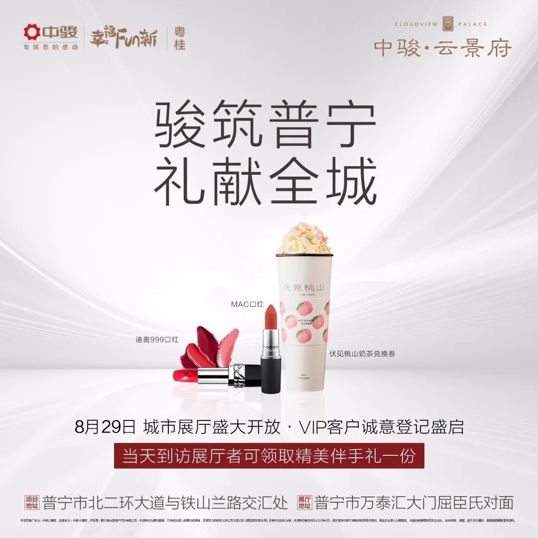 中骏集团成立于1987年,总部设立于上海。中骏自成立伊始就开始显现出其包容与张力。以“创建智慧生活,让幸福触手可及”为使命,始终坚持客户至上,立志“打造受人尊敬的百年企业,成为卓越的美好生活引领者”。 (实景图) 33年积累与沉淀,中骏重点布局长三角经济圈、环渤海经济圈、粤港澳大湾区、中部经济区、西部走廊及海峡西岸经济区,现已进入超50多个城市,经过33年的成长,如今已成为全国35强的上市房企,开发的项目涵盖住宅地产、商业地产、文化旅游地产、产业地产等维度;遍布上海、北京、深圳、重庆、天津、杭州、南京、厦门等城市;所开发的产品无一例外地成为了当地的标志性建筑。 (示意图) 幸会普宁 对话未来 “千年商都”,千年以来普宁都是周边的商业都会。这里曾经是中医药文化巅峰与地标。一座拥有悠久历史的古都,承载着深厚的地脉与厚重的文脉。如今,中骏带着“专筑您的感动”的愿景初至普宁,匠心和鸣,将共奏人居新乐章。 (实景图) 33载,中骏集团始终秉持“专注客户需求的匠心精神”,持续为社会创建美好幸福生活!中骏·云景府(楼盘详情户型图相册地图0663-2559559)也将成为升级普宁人居的重要作品。 (实景图) 普宁北拓 争藏领地 随着普宁社会经济的发展,城市已从传统的流沙大道周边,向北外拓,资源倾注的北部,早已成为城市规划的副中心,承接普宁的发展利好,众多品牌开发商也纷纷抢滩普宁北部,蝶变成长,已成为争藏领地。 (实景图) 骏筑云景 人居封面 中骏·云景府位于普宁北部城芯,周边360°配套环伺,拥揽普宁2大城熟商圈(普宁万泰汇商圈、普宁国际商品城商圈),商圈在旁,生活非常便捷,未来价值更加值得期待,附近即享国家级示范学校华美实验学校,约400米就是斗文中学,孩子成长生活无忧无虑。 (效果图) 中骏·云景府更传承中骏“景”字系产品的DNA,以品质、低密度、绿色的现代风格,打造中央花园、阳光跑道。献礼普宁,为普宁打造人居心封面。 (效果图) 首进普宁 礼献全城 抽奖活动参与规则 扫描下方小程序码 ↓ 进入小程序,点击“去参与” 根据提示获取参与资格 ↓ 8月28日18:00 正式开奖 ↓ 中奖用户可凭小程序中奖截图 于8月29日上午11:00到访 中骏云景府城市展厅 (万泰汇大门屈臣氏对面) 兑换相应奖品 未中奖的用户亦可凭参与抽奖截图 至城市展厅兑换精美伴手礼一份 影票数量有限,先到先得 *在法律允许范围内,本活动最终解释权 归普宁中骏云景府开发商所有 活动预告 8月29日 中骏云景府城市展厅盛大开放 三重好礼,致谢普宁 登门礼 凭活动单张上门,兑换精美伴手礼1份 初见礼 到访即可参与现场抽奖活动,华为P40、香奈儿香水、香奈儿口红等好礼送不停 相遇礼 高颜值物业团队巡游,遇上即有礼 展厅地址:普宁市万泰汇大门屈臣氏对面 联系电话:0663-618 0666 8月29日 邀您共鉴 免责声明 2.本规划图所载环境、交通、医疗、商业设施配套与政府规划内容等信息(含图示及文字等)旨在提供相关信息参考,均存在不具体或不确定因素,本规划图所载信息,不在任何意义上作为开发企业的邀约或承诺,买受人应自行查证、了解,不意味着本公司对此做出了承诺; 3.本资料为要约邀请,买卖双方的权利义务以及双方签订的《商品房买卖合同》为准。相关内容如有更新,请以最新资料内容为准,恕不另行通知; 4.活动最终解释权在法律允许范围内归开发商所有。