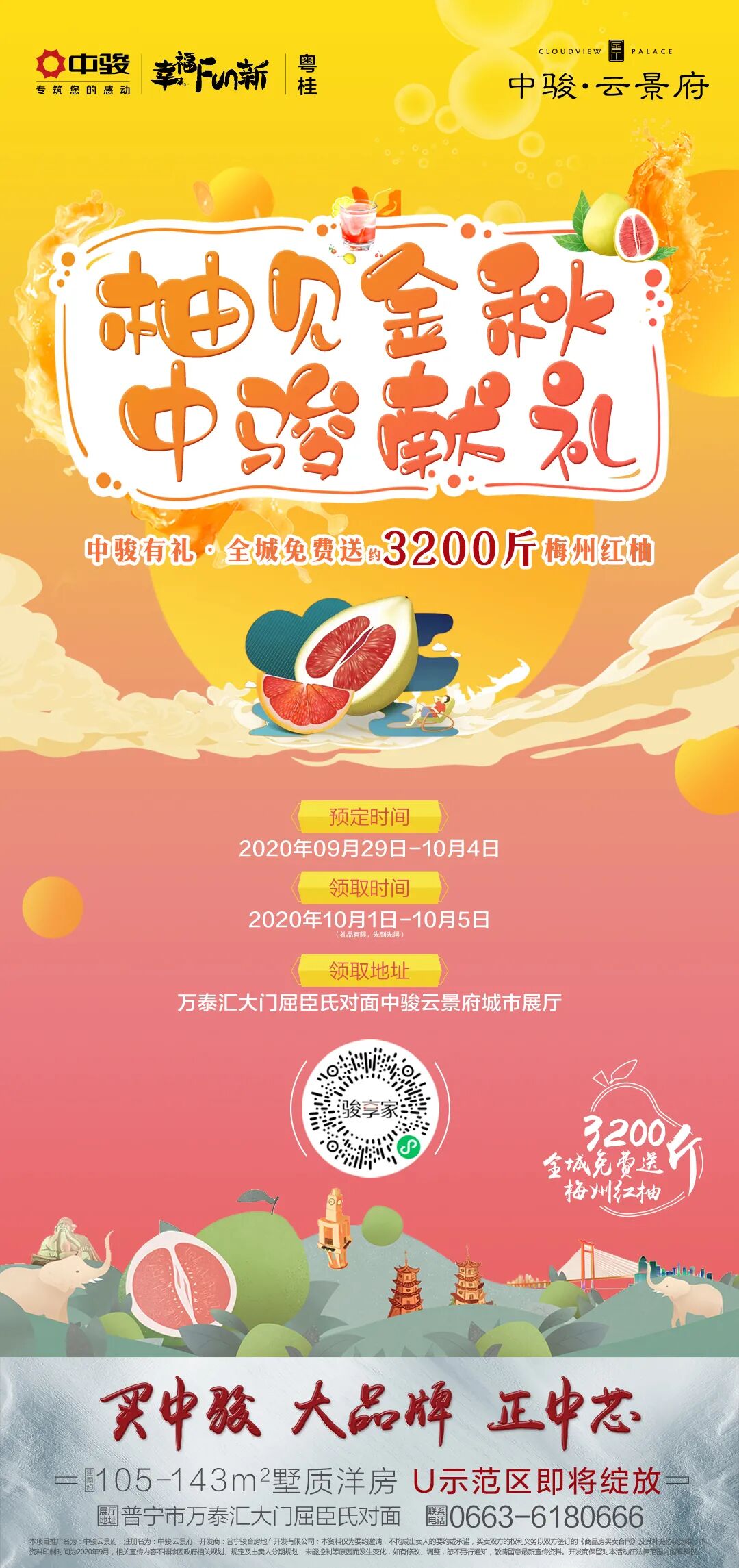 为感谢普宁街坊一直以来的支持,国庆中秋双节皆至,中骏·云景府(楼盘详情户型图相册地图0663-2559559)回馈普宁街坊的厚爱,以“柚”为礼,感谢一路“柚”你!