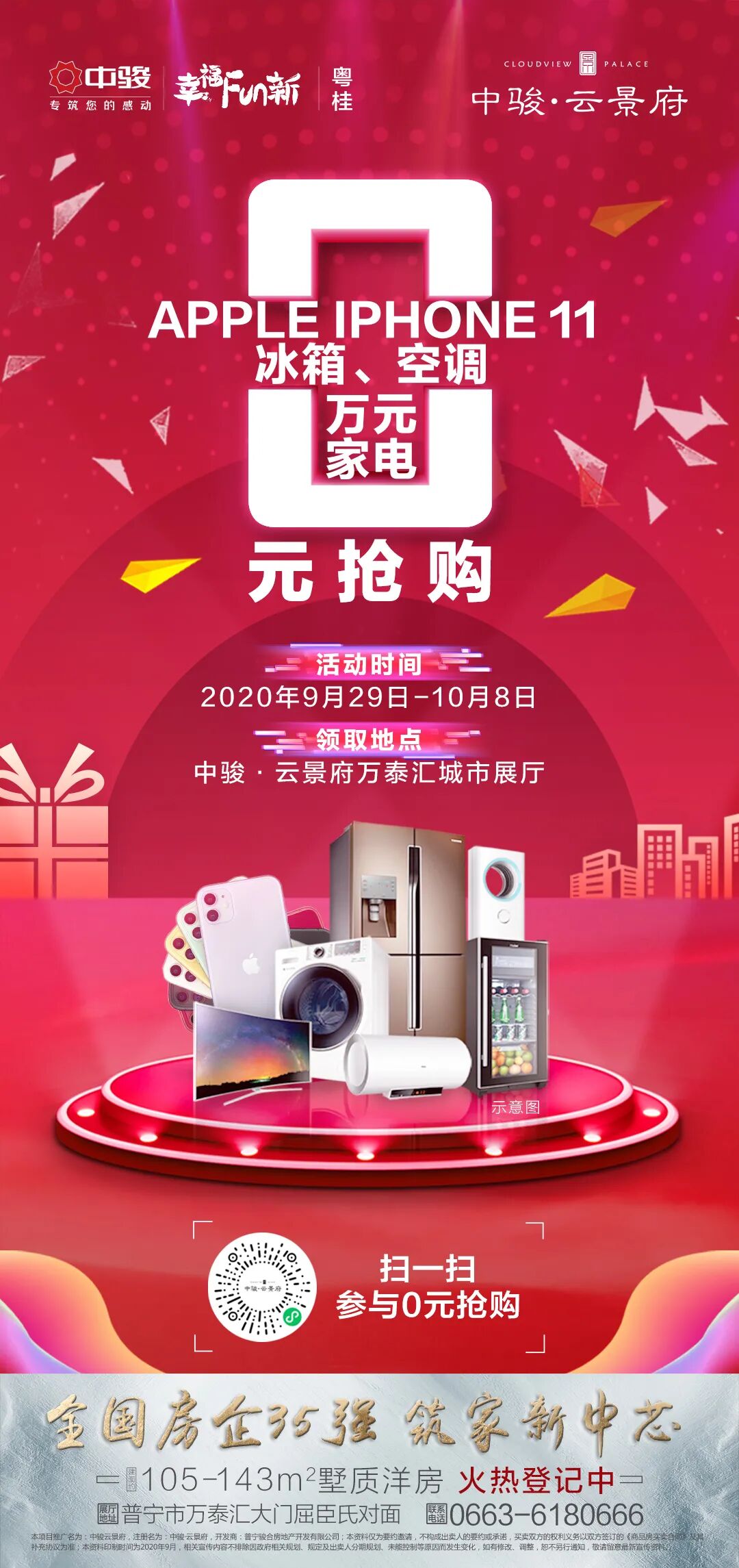 双节同临福利加码,中骏云景府国庆第二波官方福利准备了: 苹果iPhone11 、豪华电冰箱、实用洗衣机、清凉空调扇、家用电烤箱、烹饪厨具三件套、电磁炉及电热水壶等超万元礼品。千载难逢的0元抢购的机会,这次可千万别再错过啦!